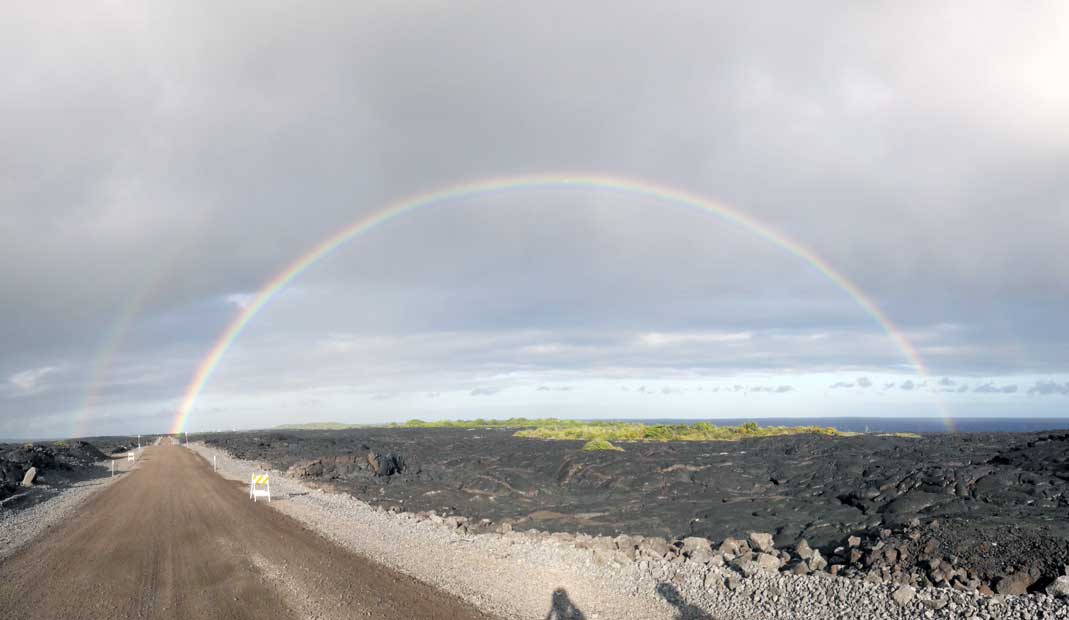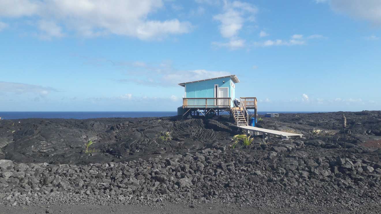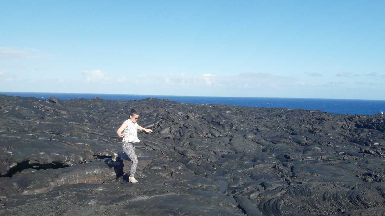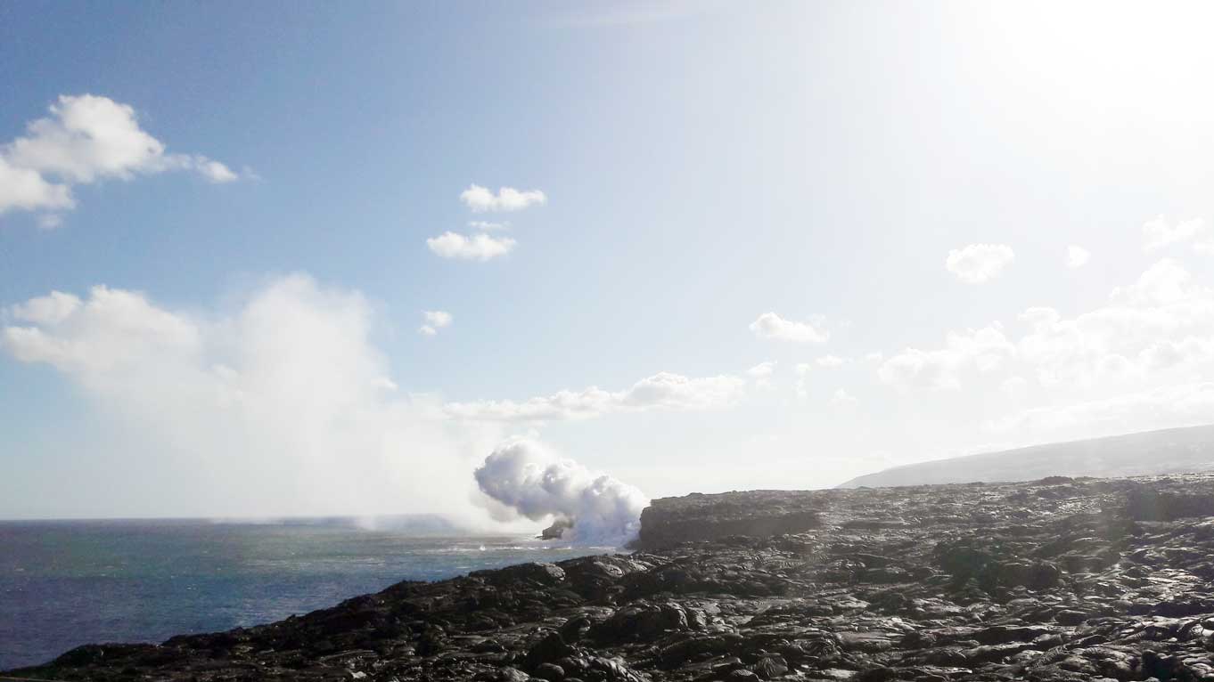 Kalapana est une petite ville qui a été rayée de la carte après l’éruption volcanique des 90’s. Il paraît que sa plage de sable noir était idyllique. Ça fait mal au cœur mais ce qu’elle a laissé derrière elle n’est pas plus mal. En effet, certains des habitants de cette ville de Big Island n’ont pas voulu mettre derrière eux leur vie de rêve à Kalapana et ont tout simplement construit leur maison sur … la lave ! Vous pouvez profiter de cette vue sur 10 km pour aller vous émerveiller devant la lave qui se déverse dans l’océan. On peut le faire à pieds, mais pour ceux qui ont la flemme (comme nous), vous pouvez louer des vélos. Pas de panique, vous les trouverez facilement sachant qu’ils sont une dizaine de loueurs sur une esplanade recouverte de lave. Impossible de les rater !