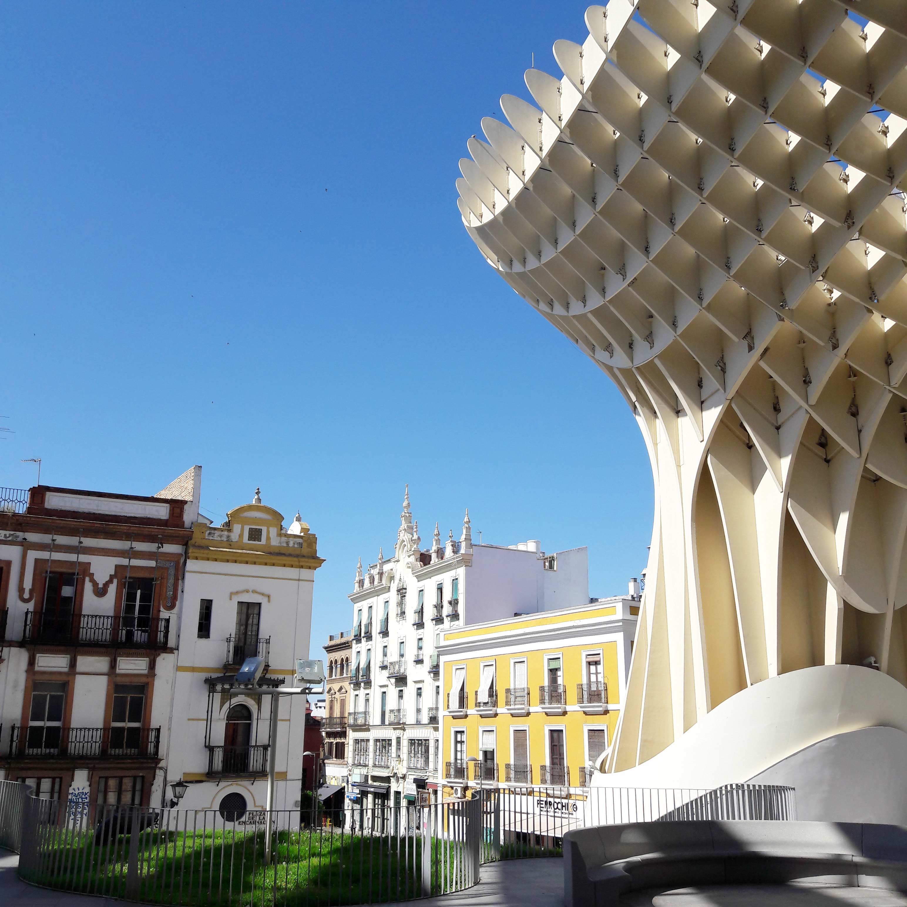 Cette structure entièrement en bois (la plus grande au monde) a été très controversée par les habitants de Séville et on peut comprendre pourquoi quand on observe l’architecture plutôt typique des alentours (et aussi parce que la construction a coûté plus de 30 millions d’euros à la ville et pour des raisons budgétaires ne s’est achevée qu’en 2011 soit 6 ans après son commencement !)