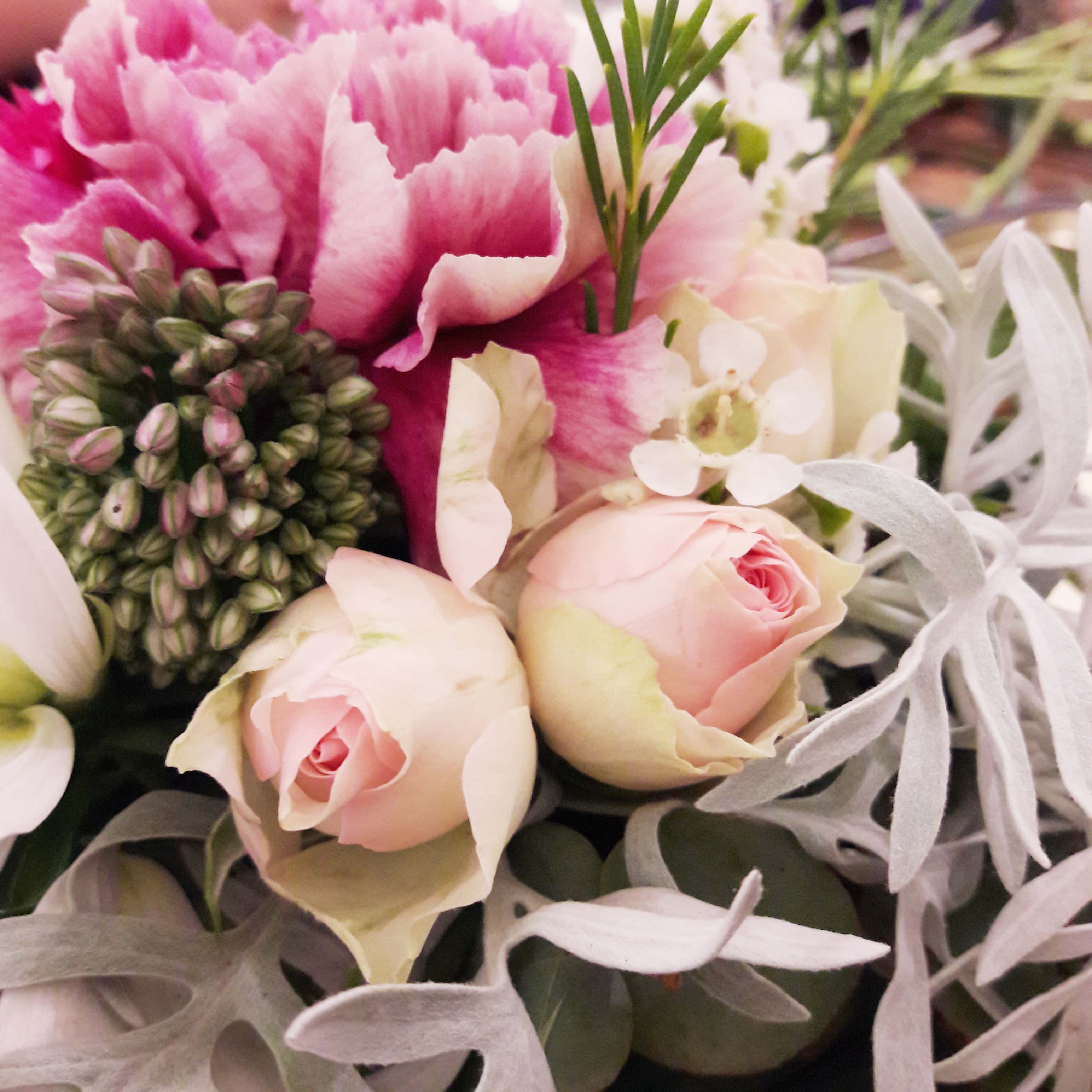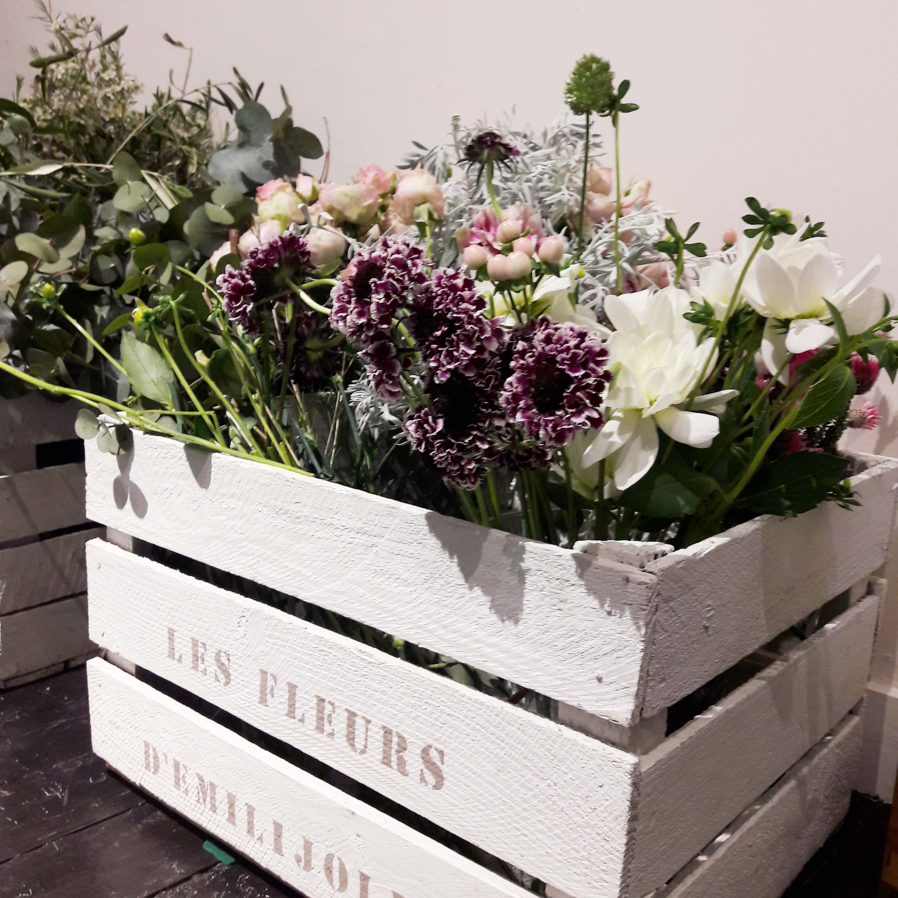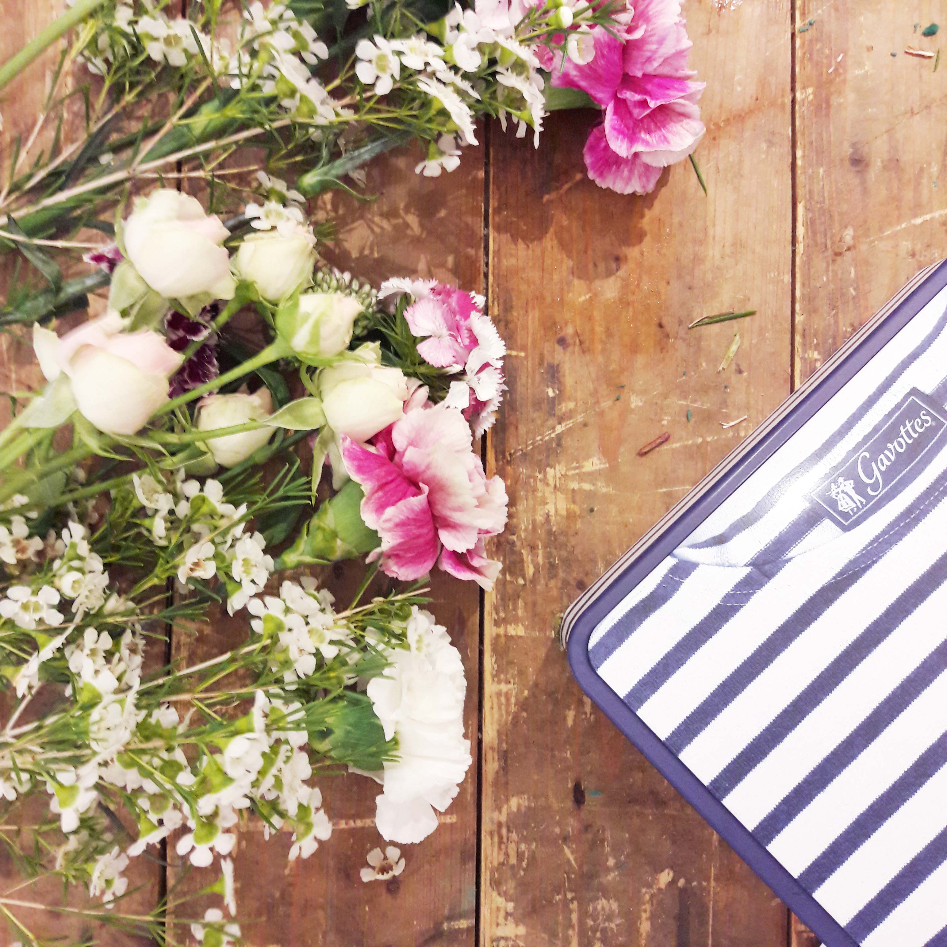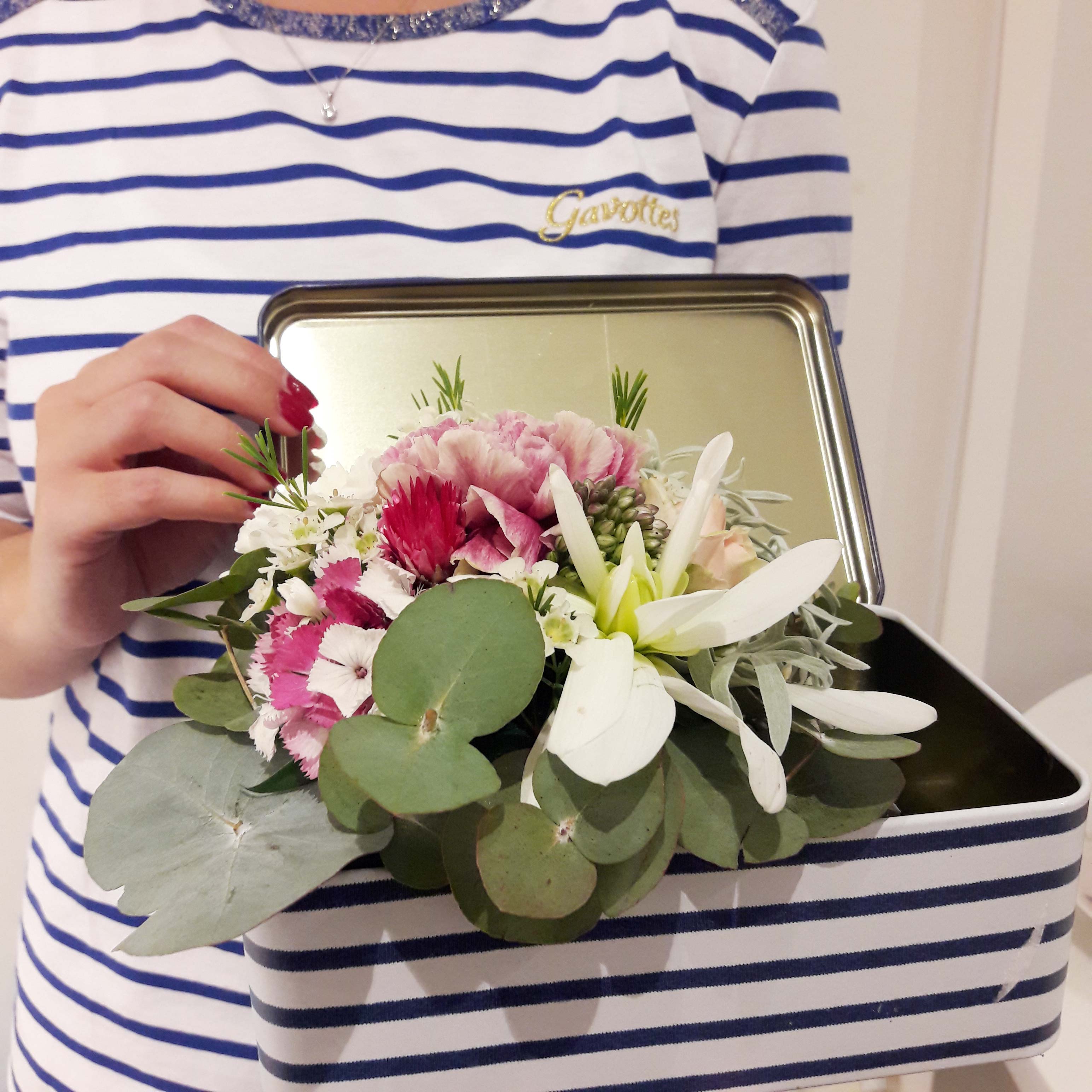 L’atelier de la soirée était la confection d’un joli coffret fleuri par Les Fleurs d’EmiliJolie. C’est dans une boîte en fer de Gavottes que nous avons créé une composition florale. Je ne vous raconte pas l’état de la table, elle était aussi jolie que ce que nous étions en train de créé avec toutes ces fleurs éparpillées partout.