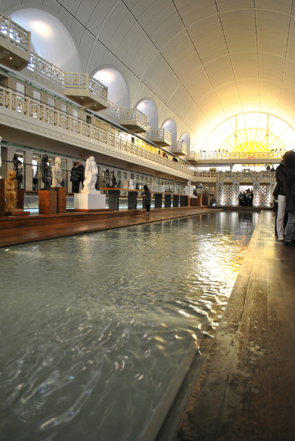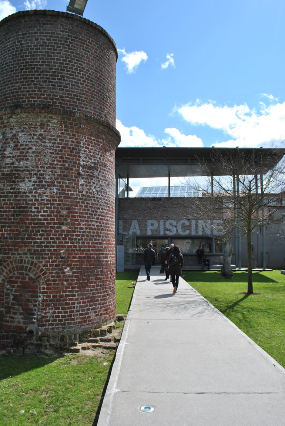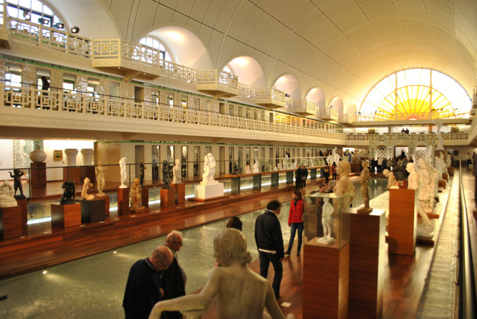 En 1922, porté par le mouvement hygiéniste, le maire de Roubaix Jean-Baptiste Lebas charge l’architecte Albert Baert de construire « la plus belle piscine de France ». Il faut dix ans de travaux pour mener à bien le projet et la piscine ouvre ses portes en 1932. C’est à la fois une piscine sportive, avec son bassin olympique de 50 mètres, et un établissement public de bains-douches. Le complexe est organisé autour d’un jardin, la roseraie, à l’image des abbayes cisterciennes. Le bâtiment principal renferme le bassin, éclairé de vitraux qui symbolisent le soleil levant et le soleil couchant. Il est encadré de baignoires disposées sur deux étages, le long des façades sur jardin. Il comprend également un « réfectoire des nageurs », un salon de coiffure, de manucure et de pédicure, des bains de vapeur et une laverie industrielle. La piscine restera en activité jusqu’en 1985, date à laquelle elle est fermée pour raisons de sécurité. L’entrée du musée. En 1990, le conseil municipal et la direction des musées de France forment le projet de transformer le lieu désaffecté en musée. À la suite d’un appel à projet international, le chantier est confié à l’architecte Jean-Paul Philippon. Les travaux s’échelonnent de janvier 1998 à la fin de l’automne 2001 et l’inauguration du musée a lieu en octobre 20012. (texte Wikipédia)